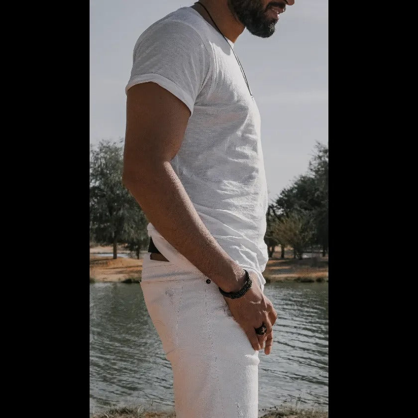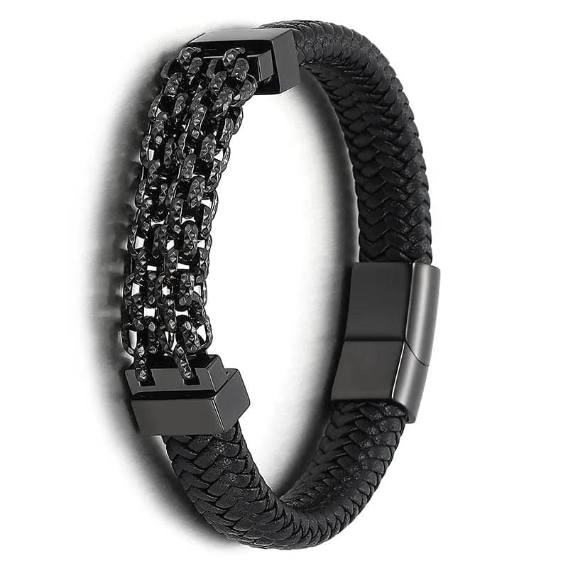 AOK-London Introducing our black leather bracelet, a perfect blend of style and sophistication. The black leather combination creates a sleek, modern and sophisticated look, making it perfect for any occasion. The bracelet is made of high-quality materials and features a durable,. A stylish and timeless bracelet that will elevate any man's look.