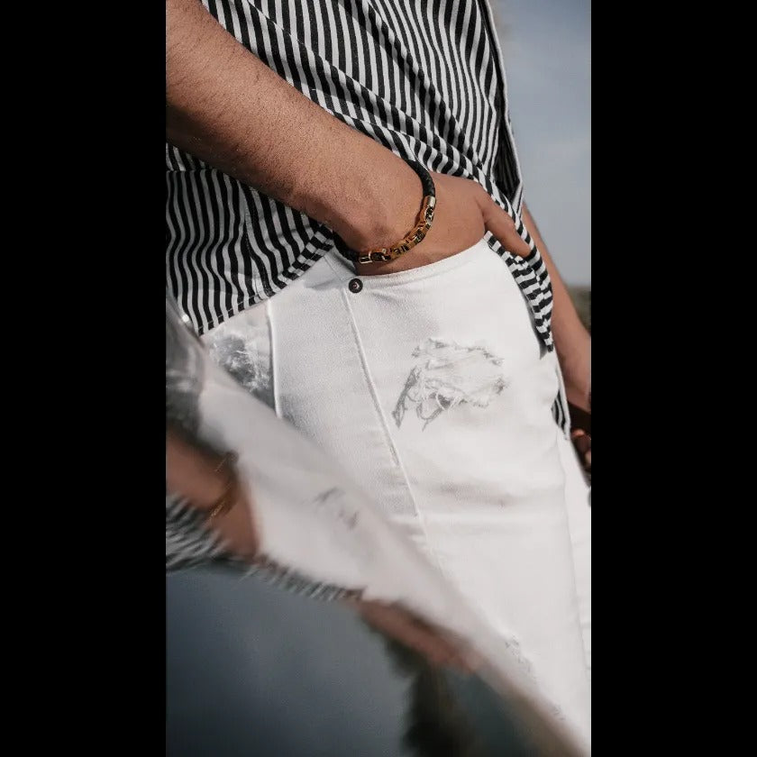 Aok-Fashion Introducing our black leather and gold bracelet, a perfect blend of style and sophistication. The black leather and gold color combination creates a sleek, modern and sophisticated look, making it perfect for any occasion. The bracelet is made of high-quality materials and features a durable, gold-plated clasp. A stylish and timeless bracelet that will elevate any man's look.